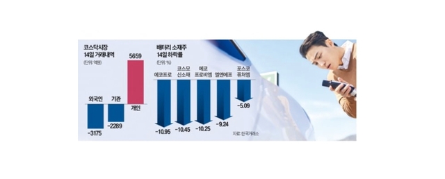 외국인과 기관투자가가 매도세를 주도했다. 외국인과 기관은 이날 코스닥시장에서 각각 3175억원, 2289억원을 순매도했다. 엘앤에프, 에코프로 등 2차전지 관련주에 매도세가 집중됐다. 엘앤에프는 외국인과 기관이 총 1188억원어치를 순매도했다. 에코프로비엠과 에코프로도 각각 696억원, 480억원어치를 팔아치웠다.
