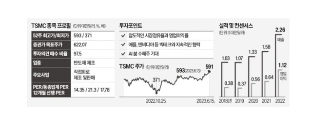 대만 증시에서 TSMC 주가는 올해 들어 31.6% 급등했다. 지난 13일엔 종가 기준 593달러로 최근 1년 내 최고가를 기록했다. 15일에도 전일 대비 4대만달러(0.68%) 오른 591대만달러에 마감했다.