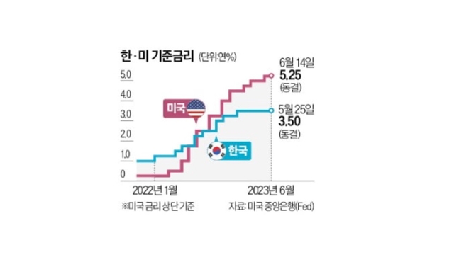 둘째는 향후 기준금리 경로다. Fed는 점도표(FOMC 위원들의 금리 전망을 점으로 표시한 도표)를 통해 올해 말 기준금리 중간값을 연 5.6%로 전망했다. 지난 3월 FOMC 때 잡은 연 5.1%에서 0.5%포인트 상향 조정했다.