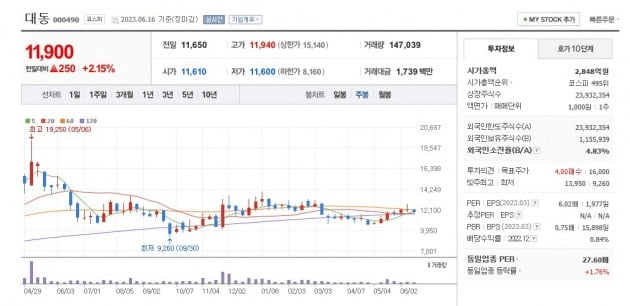 대동의 주주 구성은 어떻게 될까. 총 주식 수 2393만2354주 중 김 회장이 지분 23.99%(574만2139주)로 최대주주다. 자사주가 9.57%(228만9558주) 있다. 국민연금과 삼성액티브자산운용이 각각 지분을 5.80%, 5.04% 보유했다. 외국인 지분율은 5%에 달해 유통물량은 50% 정도다.