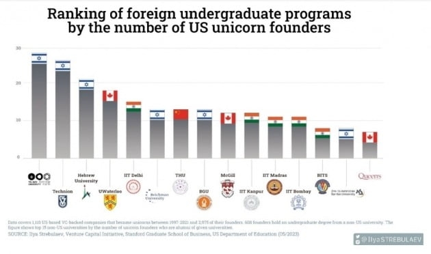 유니콘 기업 창업자를 대풀한 각국의 대학. 일야 스트레불래프 미 스탠포드대 교수 연구자료 캡처.