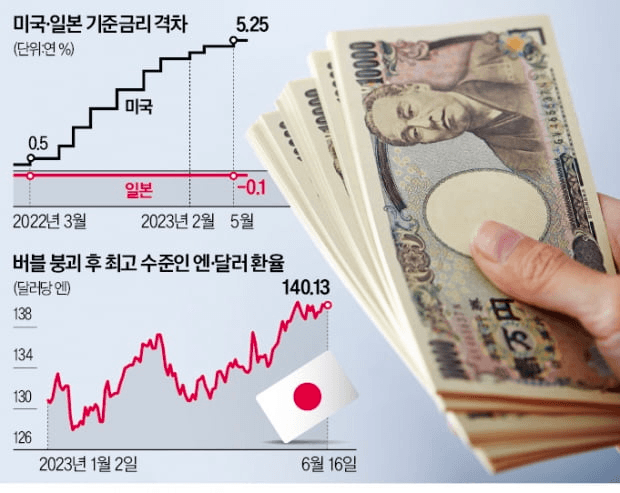통화정책 차이에 따른 내외금리 차 확대가 주된 요인이다. 지난해부터 미국 중앙은행(Fed)을 비롯한 주요국 중앙은행은 물가를 잡기 위해 기준금리를 빠른 속도로 올렸다. 일본은 요지부동이다. 일본은행은 지난 16일 금융정책결정회의에서 연 -0.1%의 기준금리를 유지하기로 했다. 미국과 일본의 기준금리 격차는 5.35%포인트다. 무역수지 적자도 엔화 약세 요인이다. 일본은 2021년 8월부터 올해 5월까지 22개월 연속 무역수지 적자를 기록하고 있다.