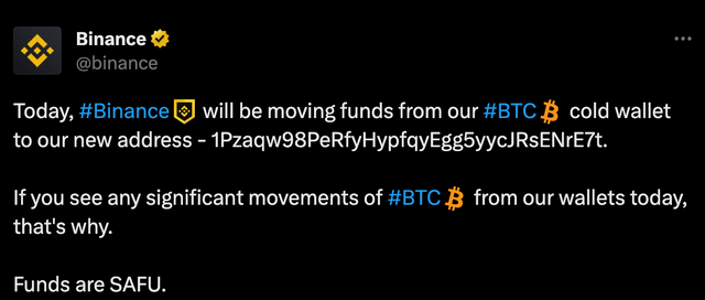 19일(현지시간) 바이낸스는 공식 트위터를 통해 "콜드월렛에서 새 주소인 ' 1Pzaqw98PeRfyHypfqyEgg5yycJRsENrE7t'로 자금을 옮길 예정"이라고 공지했다.