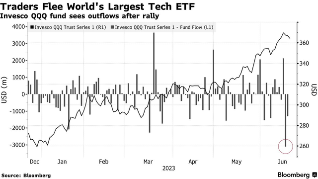 21일(현지시간) 블룸버그에 따르면 미국의 대표적인 기술주 ETF인 인베스코QQQ트러스트ETF(티커명 QQQ)에서 13억달러가량 순유출됐다. 지난 16일 31억달러가량 순 유출을 기록한 뒤 대규모 매도가 이뤄진 것이다.