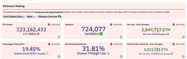가상자산(암호화폐) 분석업체 듄애널리틱스 데이터에 따르면 23일 이더리움2.0(ETH) 비콘체인에 스테이킹된 이더리움 규모는 2316만 ETH를 돌파했다. 특히 지난 상하이 업데이트 이후를 기점으로 384만9717ETH이 순유입된 것으로 나타났다.