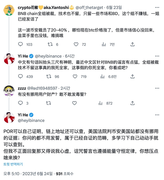 허 이 바이낸스랩스 대표 "BNB체인 팀 전체 해고는 허위 소문"