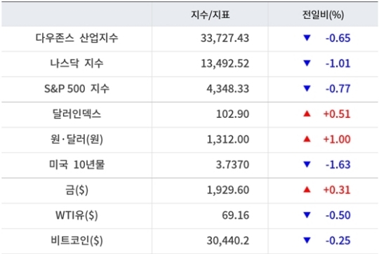 뉴욕증시는 23일(현지시간) 하락했다. 뉴욕증권거래소(NYSE)에서 다우지수는 전 거래일 대비 219.28포인트(0.65%) 하락한 3만3727.43에 마감했다. S&P500지수는 33.56포인트(0.77%) 내린 4348.33에, 기술주 중심의 나스닥지수는 138.09포인트(1.01%) 하락한 1만3492.52에 거래를 마쳤다.