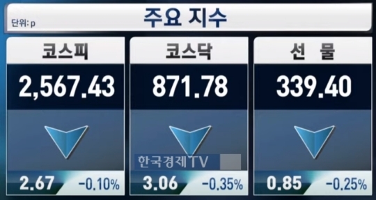 이날 코스피는 오전 9시 5분 기준 전 거래일 대비 2.67포인트(-0.10%) 내린 2,567.43을 기록 중이다. 같은 시간 코스닥 지수는 871.78로 전 거래일 대비 3.05포인트(-0.35%) 하락 출발했다.