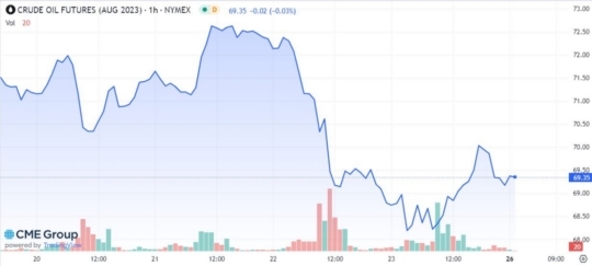 뉴욕상품거래소에서 8월 인도분 서부텍사스산 원유는 현지시간 26일 기준 전 거래일 종가보다 0.2% 오른 배럴당 69.32달러로 보합권에서 움직이고 있다.