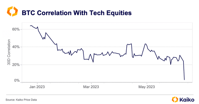 26일(현지시간) 우블록체인은 카이코의 데이터를 인용해 "비트코인과 나스닥100의 상관관계는 6월달에 3%를 기록했다"고 밝혔다. 이는 최근 3년간 가장 낮은 수치다.