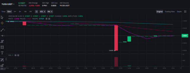 28일(현지시간) 코인데스크 보도에 따르면 바이낸스US 내 TUSD/USDT 거래 페어의 가격은 0.8000달러까지 하락한 후 소폭 반등해 현재 0.9007달러에 거래되고 있다.