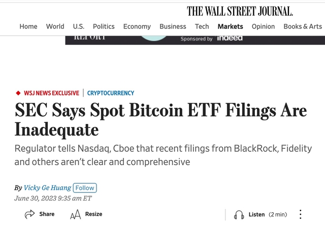 월스트리트저널(WSJ)은 30일 사안에 정통한 소식통을 인용 "미 증권거래위원회(SEC)는 최근 블랙록, 피델리티 등 자산 운용사들이 제출한 비트코인(BTC) 현물 상장지수펀드(ETF) 신청 서류들이 명확하지 않고 불충분하다라고 밝혔다"라고 보도했다.
