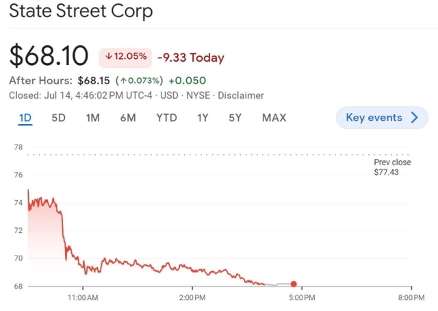 JP모건의 주가는 0.6% 오르는 데 그쳤고 웰스파고는 0.3%, 씨티는 4.05%나 급락했습니다. 특히 지역은행들은 내림세가 두드러졌습니다. 오늘 실적을 내놓은 스테이트 스트리트 은행의 경우 12%나 폭락했습니다. 스테이트 스트리트의 경우 이자를 주는 예금에 지급되는 평균 이자가 1분기 2.25%에서 2분기 2.75%로 뛰었습니다. 무이자 예금에서 이자 예금으로 상당한 이동이 있었고, 순이자 마진이 1분기 1.31%에서 2분기 1.19%로 감소했습니다. 예금이 대형은행 등으로 이탈하자 이자를 더 주면서 이익 기반이 약화한 것이죠. 월스트리트저널(WSJ)은 "투자자 우려는 스테이트 스트리트가 JP모건과 같은 대형은행보다 업계 상황을 보여주는 더 나은 신호탄이 될 것이라는 점"이라고 지적했습니다. KBW 지역은행 지수는 1.90% 하락했습니다.