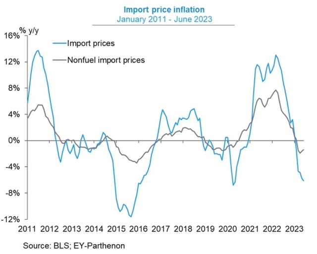 6월 소비자물가, 생산자물가에 이어 발표된 6월 수입물가도 전월보다 0.2% 내렸습니다. 5월에 0.4% 하락한 데 이어 2개월 연속 하락세를 보였습니다. 월가 예상치(-0.1%)보다도 낮았습니다. 전년 동기 대비로는 6.1% 하락한 것으로 나타났습니다. 5개월 연속 하락세입니다.