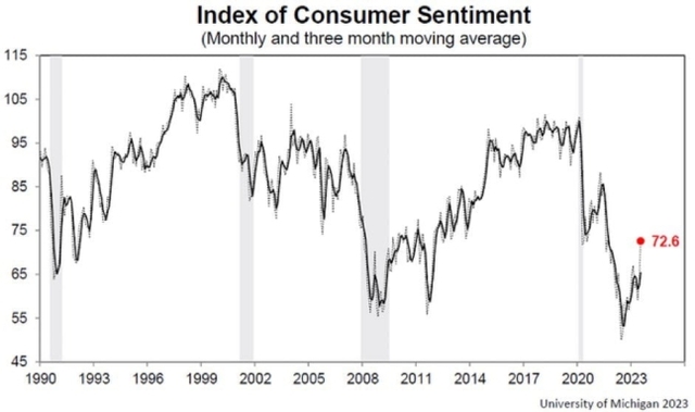 미시간대 7월 소비자심리지수(예비)는 72.6으로 급등해 전월 치(64.4)나 월가 예상(65.5)을 크게 상회했습니다. 두 달 연속 상승세로 2021년 9월 이후 1년 10개월 만에 가장 높은 수준입니다. 미시간대는 인플레이션 완화와 노동시장이 탄탄해 심리가 크게 개선됐다고 설명했습니다. 현재 여건 지수는 77.5로 전월 69보다 높아졌고, 전망을 나타내는 기대지수는 69.4로 전월 61.5보다 상승했습니다.
