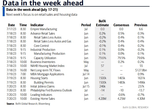 다음주 경제 지표 발표 일정은 대체로 가볍습니다. 6월 소매판매, 산업생산이 나오고 7월 NAHB 주택시장지수, 6월 주택착공 건수, 6월 기존 주택 판매 등 주택 관련 지표가 많습니다. Fed 멤버들도 쉽니다. 25~26일 열리는 FOMC를 앞두고 블랙아웃(침묵) 기간에 들어갑니다. 어닝시즌은 본격화됩니다. ▲18일 뱅크오브아메리카 ▲19일 골드만삭스, 테슬라, 넷플릭스 ▲20일 아메리칸에어라인, 유나이티드에어라인 ▲21일 아메리칸익스프레스 등이 성적표를 공개합니다.