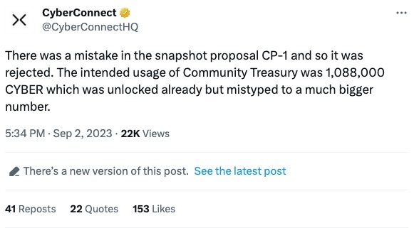 사이버커넥트는 이날 공식 엑스(옛 트위터)를 통해 “우리의 유동성 제안인 ‘CP-1’은 중간 실수가 있어 부결됐다”면서 “우리는 이미 언락된 108만8000개의 CYBER를 활용하려 했는데 제안에는 실수로 10배 숫자를 넣었다”라고 설명했다.