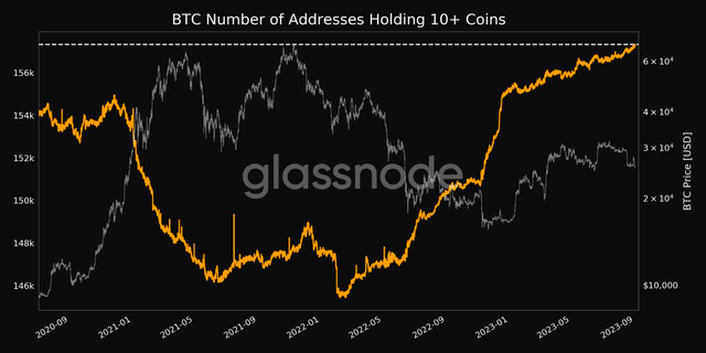 비트코인(BTC)을 10개 이상 보유한 주소 수가 15만명을 넘기며 3년만에 최고치를 기록했다.