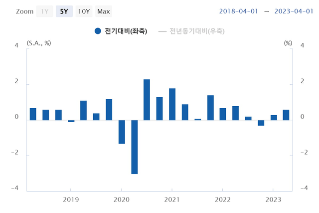 투자는 건설투자가 0.8% 감소했지만 설비투자는 0.5% 증가했다. 운송장비 투자가 줄었으나 기계류 투자가 늘어난 영향이다. 지식생산물 투자도 0.7% 증가했다. 재고는 0.3% 감소했고, 수출입은 각각 0.9%, 3.7% 줄었다.