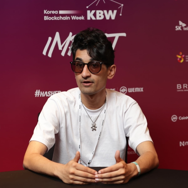 '프랭크 디갓(Frank DeGods)'이라는 예명으로 활동하는 NFT 크리에이터 로훈 보라(Rohun Vora)가 6일 서울 중구 신라호텔에서 개최된 '코리아블록체인위크 2023(KBW 2023)'에서 블루밍비트와 인터뷰를 진행하고 있다. / 사진=KBW 2023