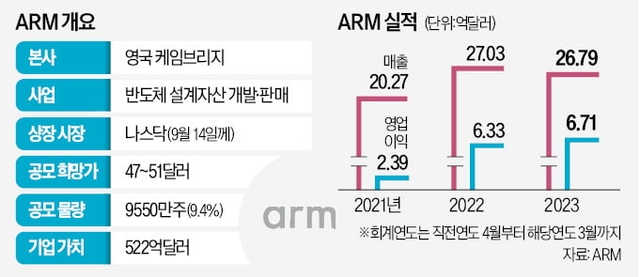 ARM 지분 100%를 보유 중인 소프트뱅크는 전체 지분의 9.4%인 9550만 주를 공모를 통해 시장에 내놓을 계획이다. 희망 공모가격은 주당 47~51달러로 정해졌다. 이 경우 기업가치는 최소 481억달러, 최대 522억달러가 된다. 소프트뱅크가 목표한 기업가치(620억달러)엔 못 미치지만 2016년 인수가(320억달러), 엔비디아가 제시한 매입 가격(400억달러)보다는 크다.
