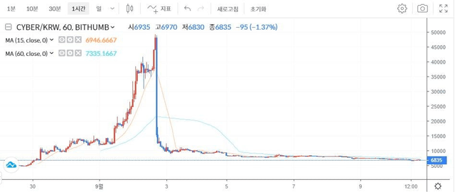 사이버 커넥트 어카운트 개설, 가스피, 거버넌스 참가 등의 용도로 사용되는 유틸리티 토큰 CYBER는 지난달 29일 빗썸에 상장된 후 꾸준히 강세를 보이다 지난 2일 장중 상장가(4833원) 대비 1000% 가량 급등해 4만8000원대를 기록하기도 했다. 이후 급락, 지금은 전일 대비 1.27% 하락한 6610원에 거래되고 있다.
