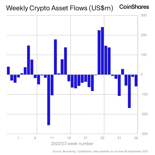11일(현지시간) 코인셰어즈의 데이터에 따르면 지난주 가상자산 투자 상품에서 5930만달러가 유출되면서 4주 연속으로 순유출을 겪었다.