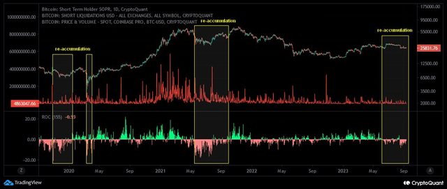 13일 크립토퀀트 기고가 BaroVirtual은 "비트코인은 지난 6월경부터 축적 국면에 있을 가능성이 높은 가운데 '단기 보유자 SOPR(155일 변화율 적용) 지표' 값이 음수 영역에 있고 숏 포지션 청산 금액이 크게 증가하는 패턴을 보인다"라며 이같이 밝혔다.