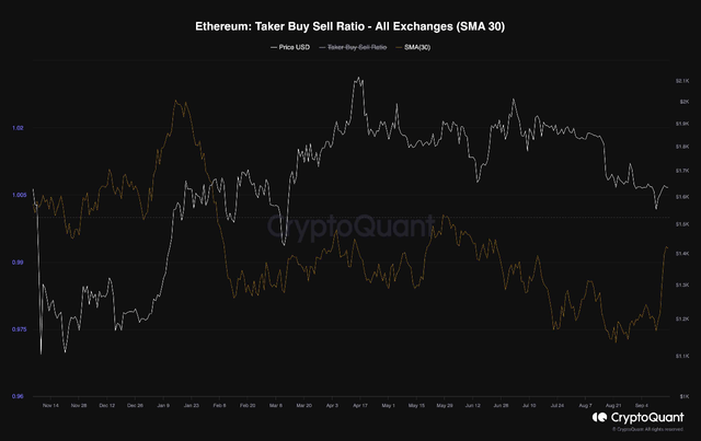 그는 "'테이커 매수-매도 비율(Taker Buy-Sell Ratio)' 지표에 30일 이동평균선을 적용한 차트에서 이더리움은 5월 이후로 음수를 보이고 있으나 최근 0에 가깝게 상승을 보이고 있다"고 말했다.