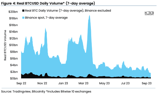 20일(현지시간) 가상자산 전문 미디어 더블록은 K33 리서치를 인용해 "9월 1일 이후 중앙화 거래소들의 현물 비트코인 일일 거래량(7일 평균)이 약 48% 감소했으며, 최대 거래소 바이낸스의 경우 무려 57% 줄어들었다"라고 보도했다.