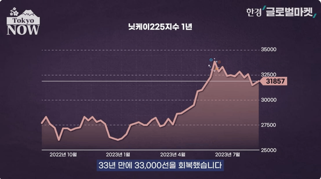부동산과 함께 대표적인 자산시장인 증시도 달아오르고 있다. 지난 6월 닛케이225지수는 33년만에 33,000선을 회복했다. 올 들어 지수가 25% 급등하면서 1989년 버블(경제)경제 붕괴 직전 기록한 38,915의 85%까지 회복했다.