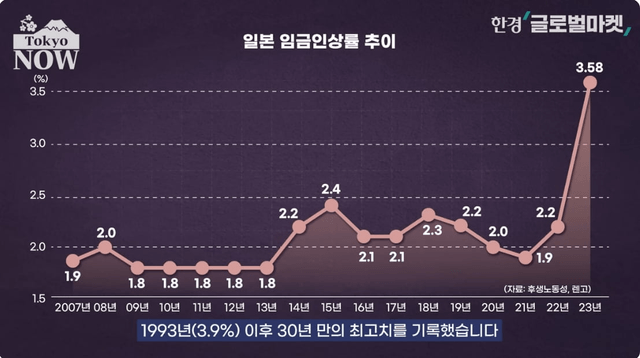 일본 최대 노동조합인 렌고에 따르면 올해 일본 기업의 임금인상률은 평균 3.58%로 1993년(3.90%) 이후 30년 만의 최고치를 기록했다. 기업의 실적과 설비투자도 사상 최고 수준을 회복했다.