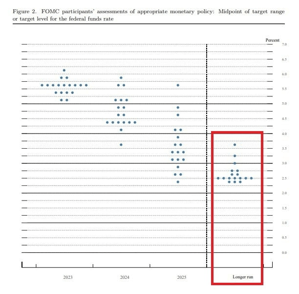 SEP 장기금리 전망치는 매 FOMC 회의 때 위원들이 점도표(dot plot)를 통해 제시하는 미래 기준금리 목표치다. 미국 경제가 안정적으로 유지되는 금리 상단치이기 때문에 사실상 중립금리와 같은 의미로 해석된다.