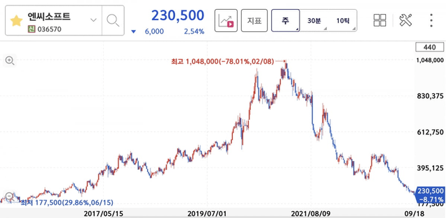 23일 한국거래소에 따르면 엔씨소프트는 전날 23만500원에 거래를 마쳤습니다. 2021년 2월 최고점(104만8000원) 대비 4분의 1토막 났습니다. 올해만 주가가 47% 급락했습니다.