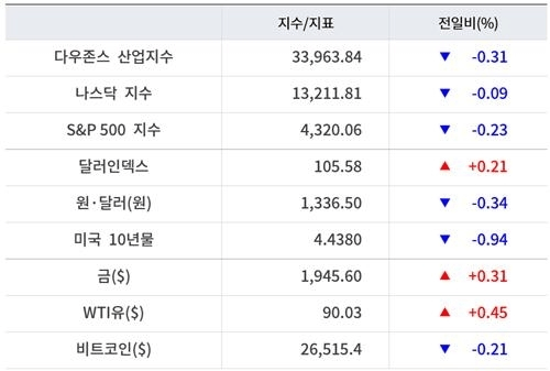 뉴욕증시가 22일(현지시간) 하락했다. 이날 뉴욕증권거래소(NYSE)에서 다우지수는 전 거래일 대비 106.58포인트(0.31%) 내린 3만3963.84에 거래를 마쳤다. S&P500지수는 전장보다 9.94포인트(0.23%) 밀린 4320.06에, 나스닥지수는 12.18포인트(0.09%) 떨어진 1만3211.81에 장을 마감했다.