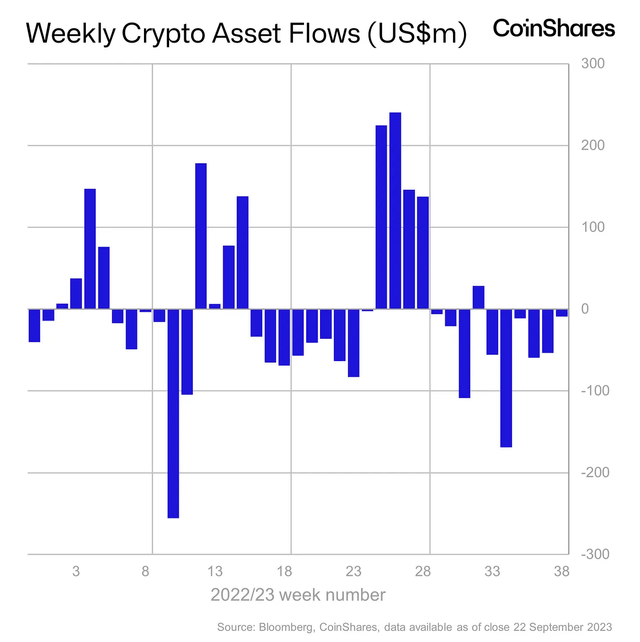 비트코인 투자 상품은 3주 연속 자금 유출을 겪었다. 이더리움은 이보다 더 긴 6주 연속 유출을 겪으며 총 220만달러가 빠져나갔다.