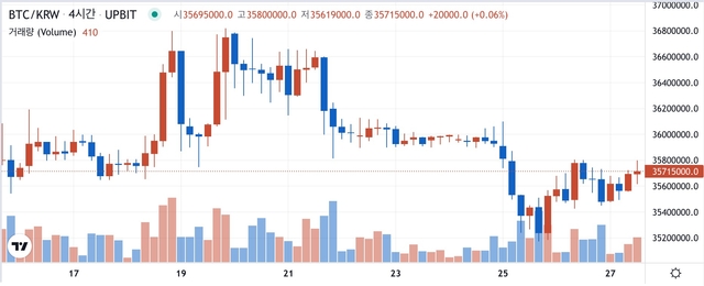 27일 오후 4시 기준 비트코인은 3572만원 부근에서 횡보를 이어가고 있습니다. 비트코인은 주요 저항선인 3700만원을 돌파하면 상승세를 더욱 이어갈 가능성이 높지만 현 지지선인 3457만원을 하회할 경우 낙폭이 더욱 커질 가능성이 있습니다.