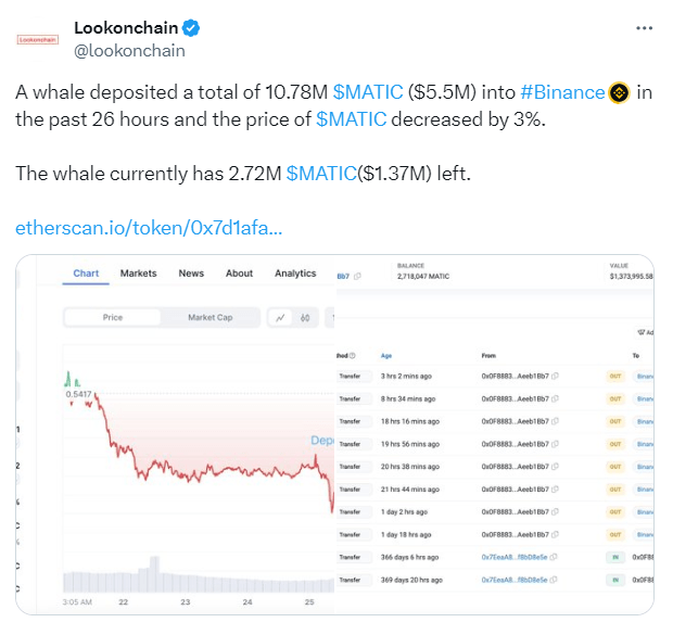 27일(현지시간) 블록체인 온체인 데이터 분석 업체 룩온체인(Lookonchain)이 X(구 트위터)를 통해 "익명의 고래 월렛이 지난 26시간 동안 바이낸스에 1097만 폴리곤(MATIC)을 입금했다"고 전했다.