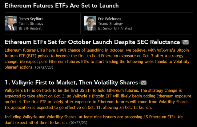 그는 "이더리움 선물 ETF는 10월 초 출시될 가능성은 약 90%로 매우 높다"라며 "발키리의 ETF가 가장 먼저 출시될 것이고 나머지 12개가 넘는 이더리움 선물 ETF들이 뒤이어 출시되면서 경쟁이 치열해질 것"이라고 말했다.