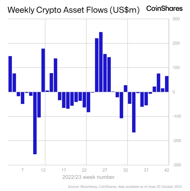 23일(현지시간) 코인쉐어스 주간 보고서에 따르면 글로벌 디지털 자산 투자 상품에 이번주 약 6600만달러의 자금이 유입된 것으로 나타났다. 이번 유입세로 총 관리 자산(AUM)은 330억달러를 돌파하게 됐다.