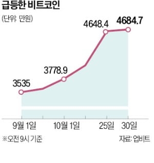 암호화폐거래소 업비트에 따르면 비트코인은 지난달 30일(오전 9시 기준) 0.03% 내린 4684만7000원에 거래됐다. 비트코인 가격은 지난달 24일(4559만9000원) 4500만원대로 올라선 뒤 하루 만에 4600만원대로 뛰었다. 한때 4736만5000원에 거래되면서 1년5개월 만에 최고치를 갈아치웠다.