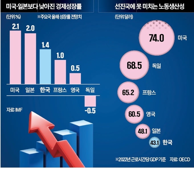 노동과 자본 투입의 부진을 상쇄할 수 있는 것은 생산성이다. 하지만 한국의 생산성은 아직 선진국과 격차가 크다. 지난해 한국의 근로시간당 국내총생산(GDP)은 43.1달러로 미국(74달러), 독일(68.5달러), 영국(60.5달러)에 한참 못 미쳤다.