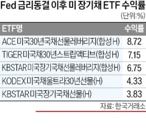 6일 ‘ACE 미국30년국채선물레버리지(합성H)’ ETF는 1.17% 오른 6045원에 장을 마감했다. 이 ETF는 미국이 금리 동결을 발표한 지난 1일 이후 이날까지 8.72% 올랐다. 다른 미 장기채 ETF도 상승세를 이어가고 있다. ‘TIGER 미국채30년스트립액티브(합성H)’는 1일 이후 수익률이 7.15%에 달한다. 같은 기간 ‘KBSTAR 미국장기국채선물레버리지(합성H)’는 6.75%, ‘KODEX 미국채울트라30년선물(H)’은 4.33%, ‘KBSTAR 미국장기국채선물(H)’은 3.83%의 수익을 올렸다.