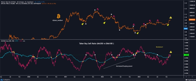 10일 가상자산(암호화폐) 분석 플랫폼 크립토퀀트(CryptoQuant)의 조아오웨드슨(joaowedson) 분석가는 퀵테이크 리포트를 통해 "최근 테이커 매수 지표는 강력한 저항대를 예고하고 있다"면서 "가상자산 시장에 조정이 곧 찾아올 가능성이 있다"라고 밝혔다.