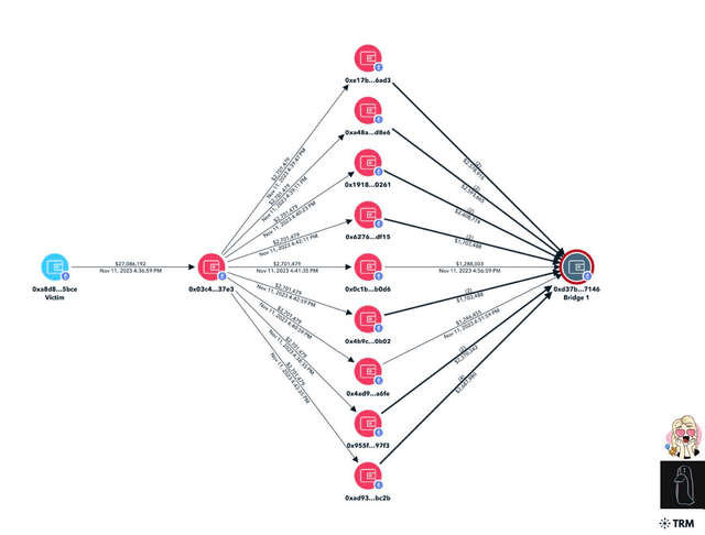 12일(현지시간) 온체인 분석 유저 'ZachXBT'에 따르면 해당 지갑은 이날 2700만USDT(테더)가 유출되는 피해를 입었다. 해커는 훔친 테더를 이더리움(ETH)으로 교환해 여러 플랫폼으로 전송했고 토르체인을 통해 다시 비트코인(BTC)으로 연결했다. 피해를 입은 지갑은 바이낸스 배포자와 연결된 것으로 밝혀졌다.