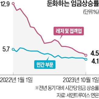 이 같은 임금 상승세 둔화는 다른 데이터에서도 나타난다. 미국 노동부에 따르면 여가 및 접객업의 평균 시간당 임금 상승률은 지난 1월 전년 동월 대비 7% 올랐지만, 10월 4.5%까지 상승률이 줄었다.