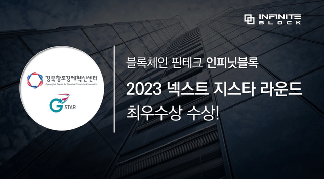 블록체인 핀테크 '인피닛블록'이 경북창조경제혁신센터가 주관한 '2023 넥스트 지스타 라운드(Next G-Star Round)'에서 최우수상을 수상했다고 16일 밝혔다.