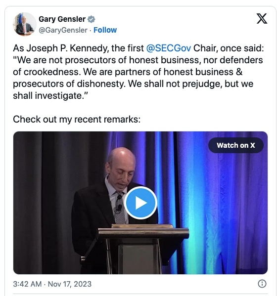 17일 가상자산(암호화폐) 전문 미디어 코인텔레그래프에 따르면 게리 겐슬러 미국 증권거래위원회(SEC) 위원장은 이날 자신의 엑스에 2023 증권집행포럼에서 연설한 영상을 공유했다. 해당 영상에서 겐슬러는 초대 SEC의장의 말을 인용하며 "SEC는 정직한 사업의 파트너이자 부정직한 업체의 기소자가 되어야 한다"라고 발언했다.