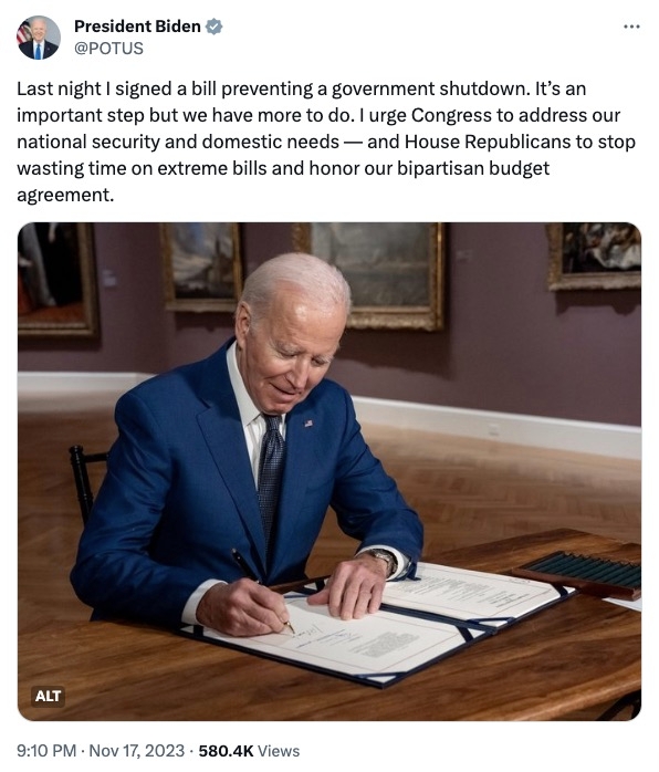 17일 미 언론 CNN에 따르면 바이든 대통령은 이날 엑스(옛 트위터)를 통해 "나는 어젯밤 연방정부의 셧다운을 방지하기 위한 법안에 서명했다"면서 "이는 중요한 단계이지만 아직 해야 할 일이 더 남아있다"라고 밝혔다.