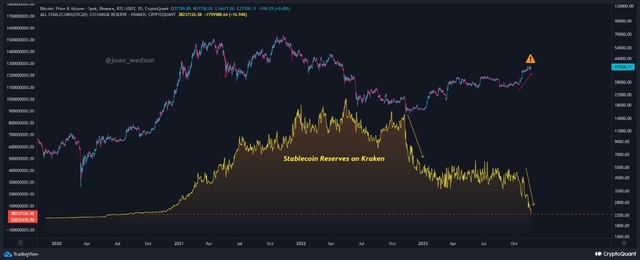 21일(현지시간) 온체인 분석 플랫폼 크립토퀀트(CryptoQuant)는 엑스(트위터)를 통해 "최근 크라켄 거래소의 스테이블코인 보유량이 2020년 10월 수준으로 감소했으며, 이는 유저들과 가상자산 시장에 위험을 초래할 가능성이 있다"라고 전했다.